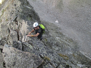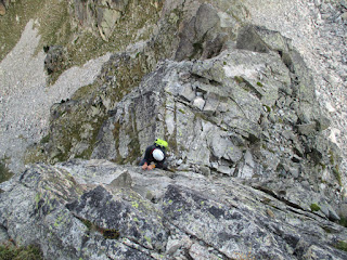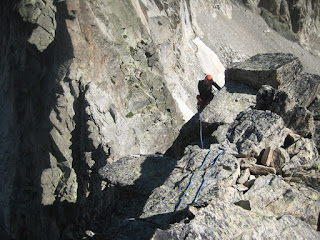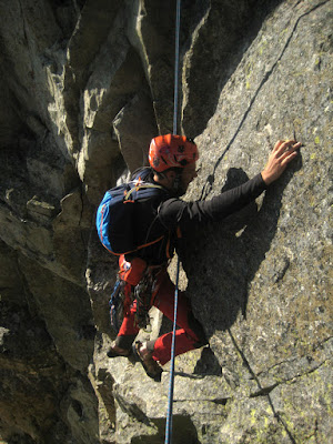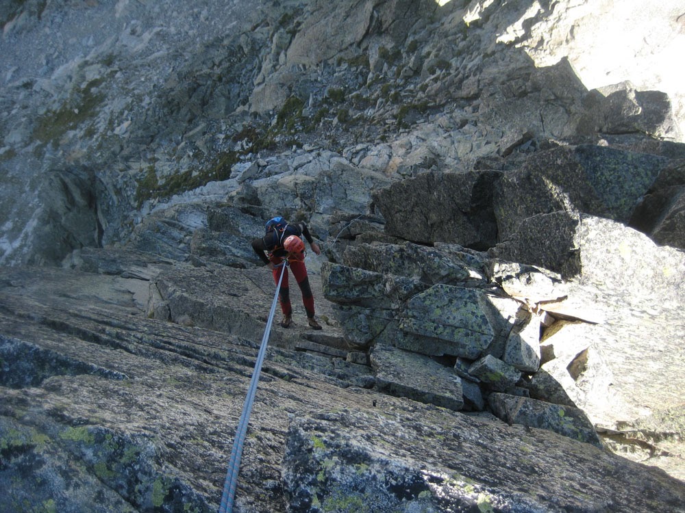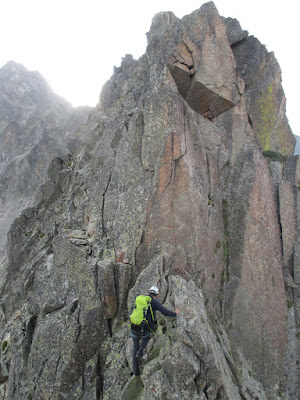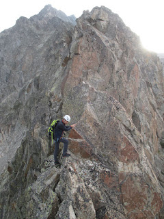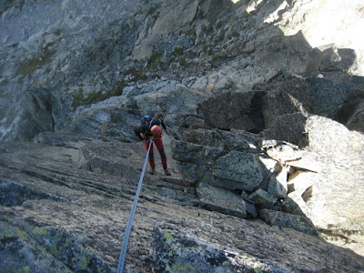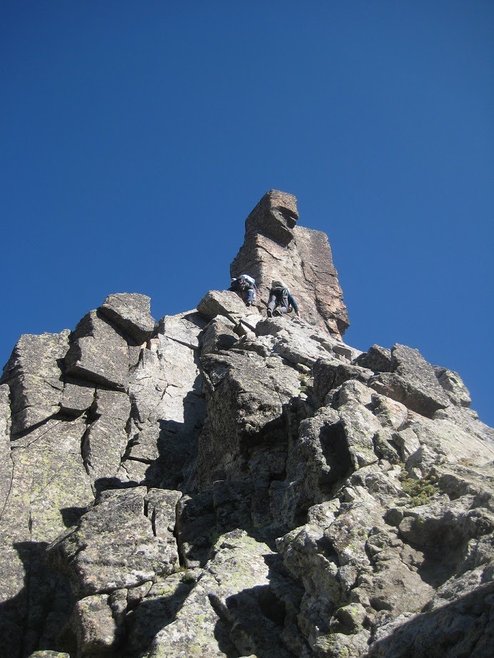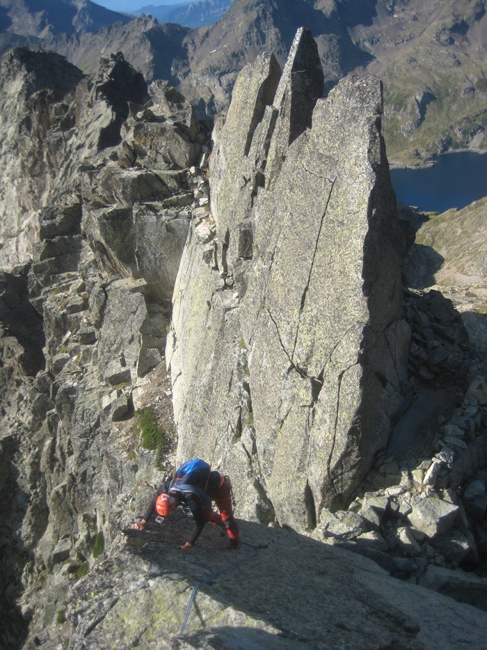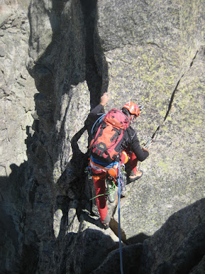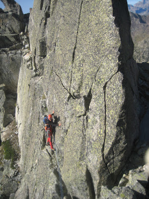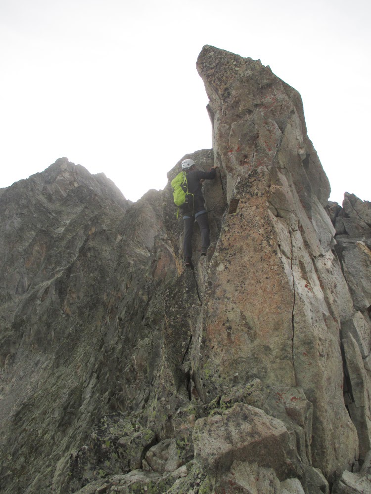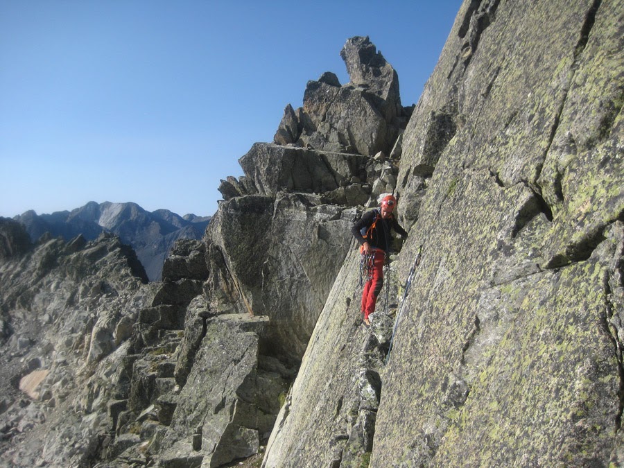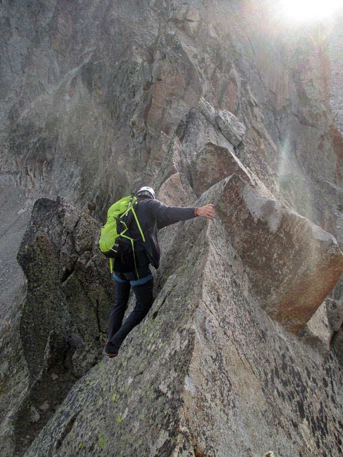 para entrar en uno de los pasos más bonitos de la cresta (III+), una gran placa inclinada surcada por fisuras que aprovechamos para apoyar los pies (vertiente francesa).