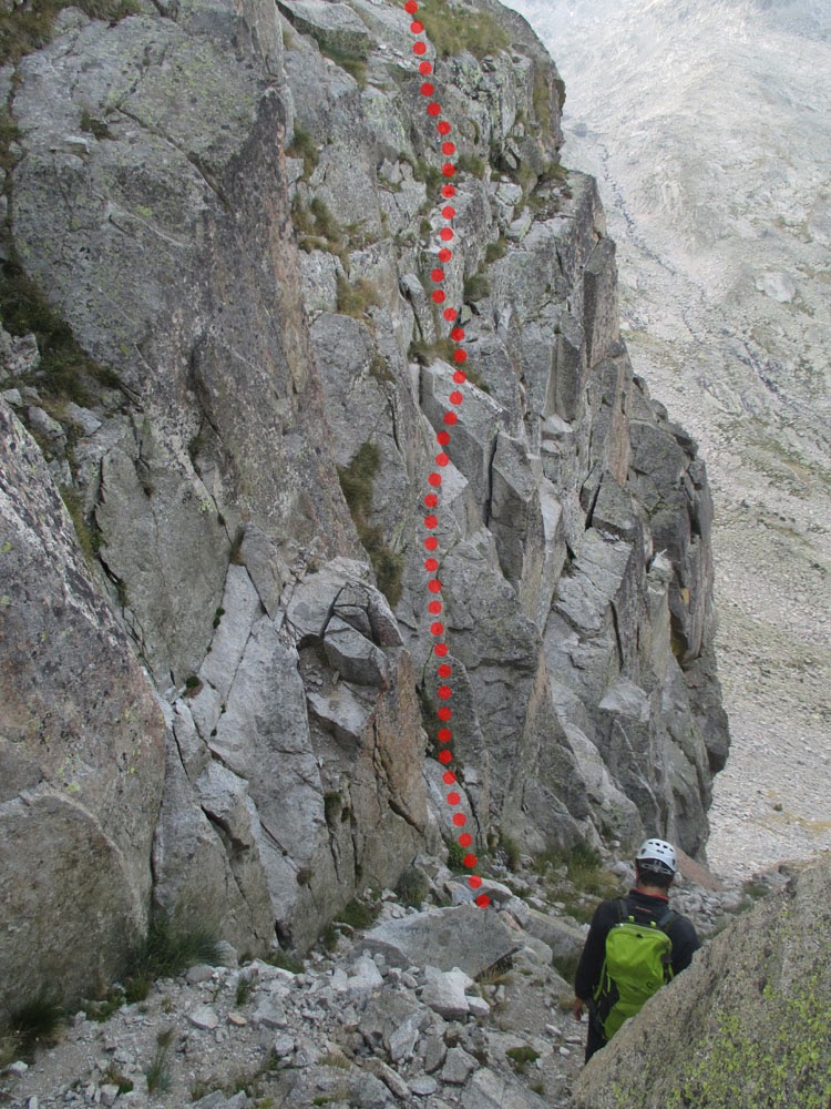 Para el descenso seguimos la cresta dirección Norte hasta encontrar una chimenea que desciende a nuestra izquierda con una instalación de parabolts bien visible (antes de llegar a esta chimenea dejamos a nuestra izquierda otras dos más verticales)