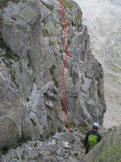 hasta toparnos con un muro blanco que nos corta el paso, protegido con dos clavos, uno de ellos con cordino (A0, 6a en libre, 7 - 8 metros). Como no tenemos ganas a estas alturas de hacer el gorila (se ve bastante vertical y liso) y llevamos más horas de lo previsto, ni siquiera nos acercamos a tantearlo, aprovechamos unos cordinos con maillón en un bloque para rapelar unos 10 metros por el lado francés y lo rodeamos. .