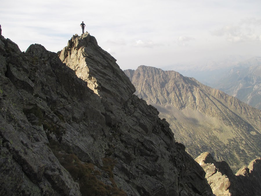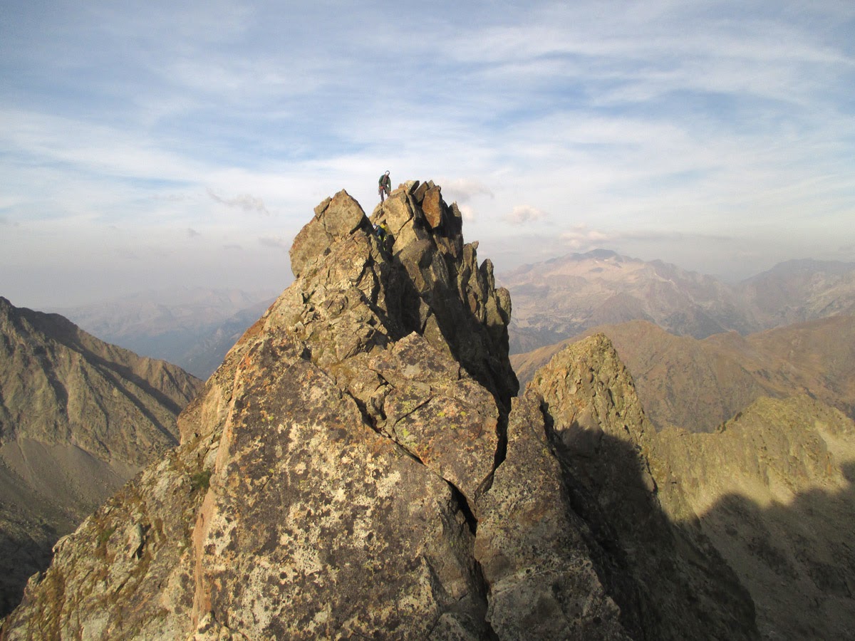 16.45. Tras un flanqueo expuesto e incómodo, llegamos a una zona cómoda donde guardamos cuerdas y trepamos hasta la cima del Soulano, donde llegamos tras casi 9 horas de cresta.