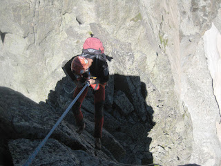 Rapelamos desde el Tridente Sur, 25 m. Mientras espero a que baje mi compañero nos alcanzan dos franceses y como van muy rápido les ofrezco la cuerda para rapelar.