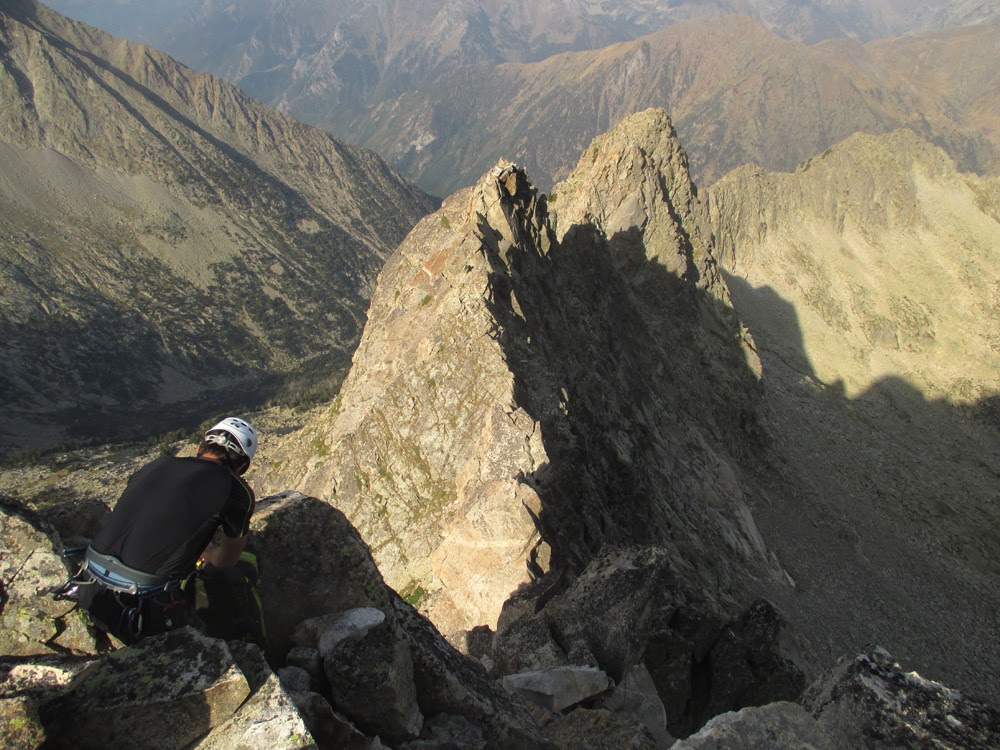 Tiempo: 8h 45' de cresta + 1h 45' descenso rápeles. En la cresta se nos fue mucho tiempo en los Cuernos por andar dudando qué hacer y en el Tridente Norte dudamos bastante sobre el itinerario.