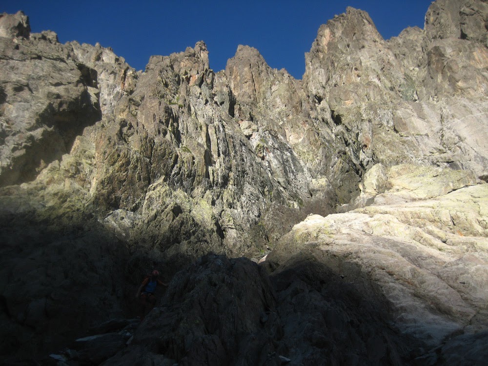 Desde la Brecha del Tridente Sur trepamos hacia el primer cuerno flanqueándolo por su izquierda.